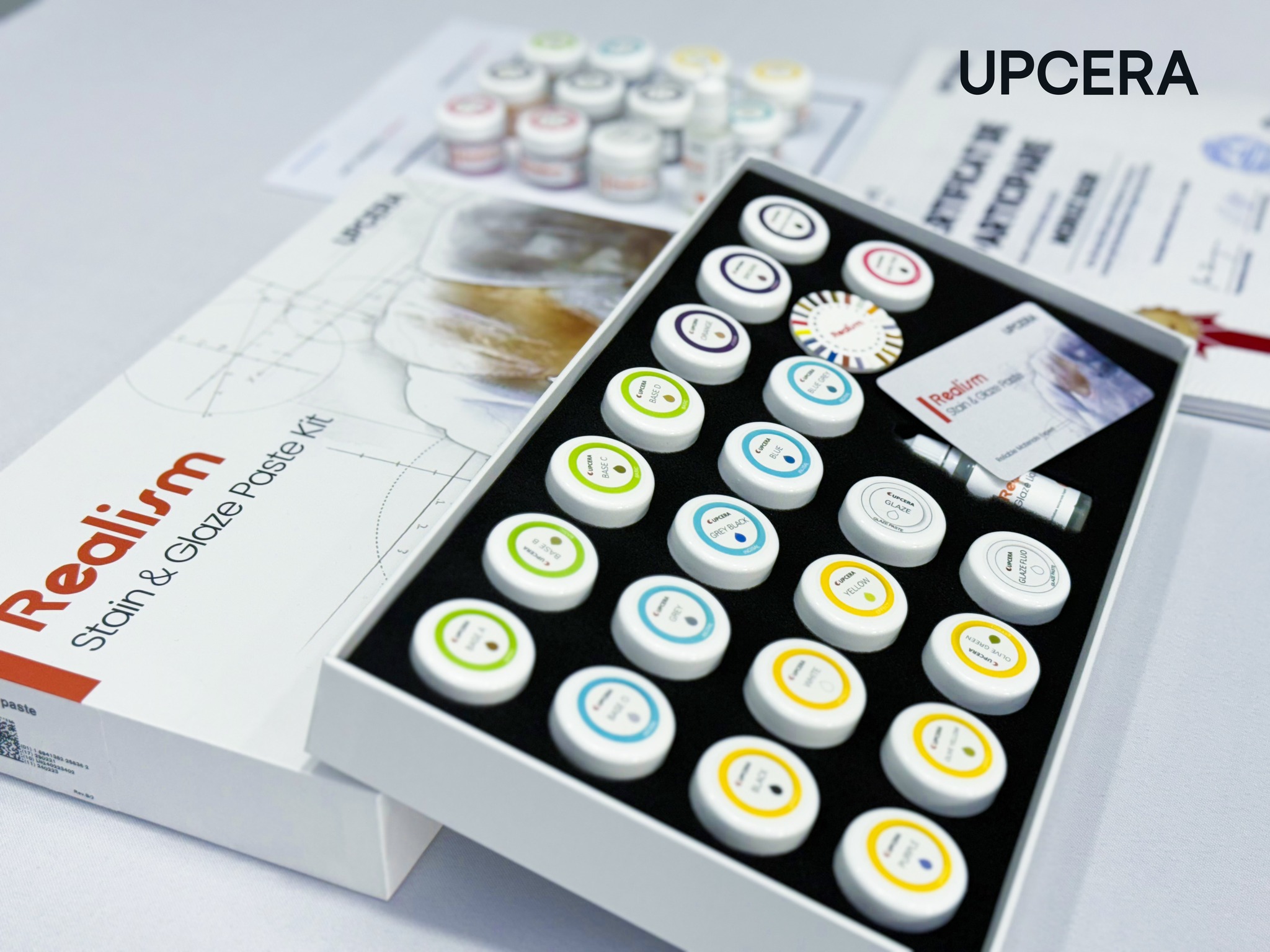 4 Basic shades, 5 Incisal shades, 3 Fossa shades, 6 Effect shades, 2 Gingival shades, 1 transparent glaze, and 1 fluoro glaze.